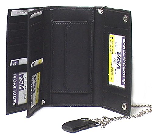 -. Feature : TRI-FOLD CLOSURE WITH 2 SNAPS. / 4 Window for Picture ID / 1 Large Change Pocket/ 1 Secret Pocket Behind Change Pocket / 14 Card Slots AND 3 Sections for Bills or other Documents / EASY TO HOLD. Measures: 6-3/4 inches (Length) and 3-1/2 inches (Height while Closed), Chain Attachment Chain Length 16 Inches ( including hooks )