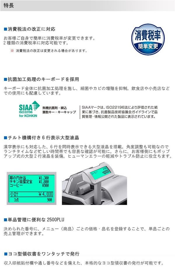| 漢字表示にも対応した、6行を同時表示できる大型液晶は、角度調整も可能なので、ランチタイムなど忙しい時間帯でも容易な確認が可能に。さらに、お客様側にもポップアップ式の大型2行液晶を装備。ヒューマンエラーの軽減や、トラブル防止に役立ちます。飲食店に適したタッチキータイプ。 |
