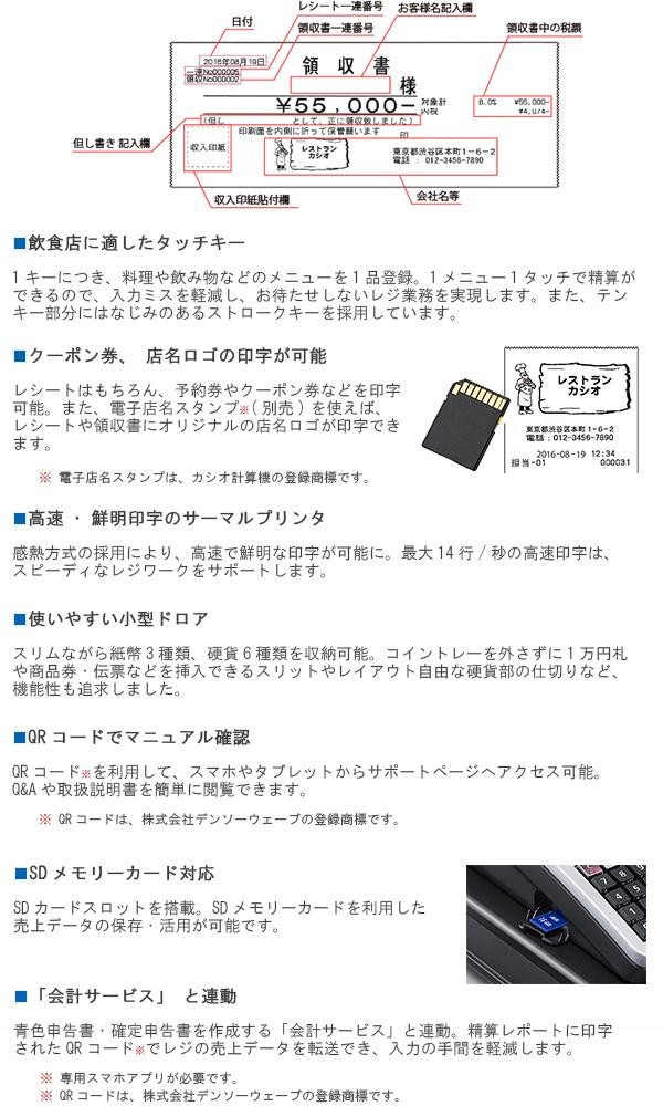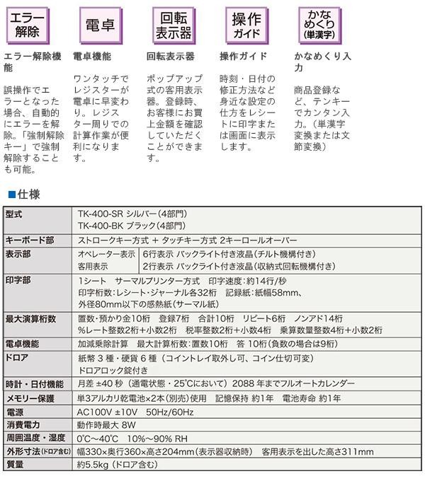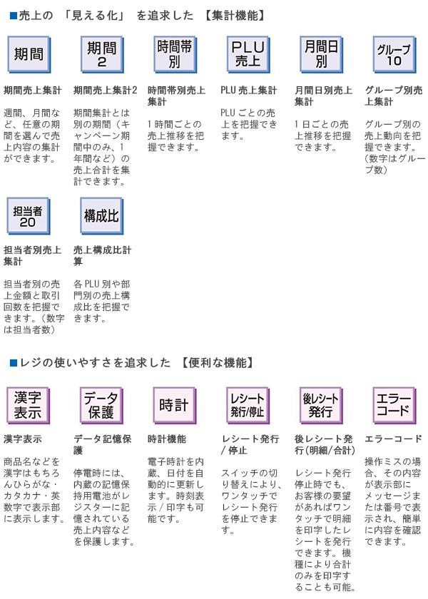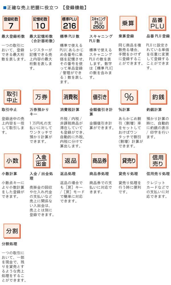 | 付属品 | 取扱説明書、保証書(1年間)、モード鍵(PGM)×2、ドロア鍵、ロールペーパー、ジャーナル巻き取りホルダー |
