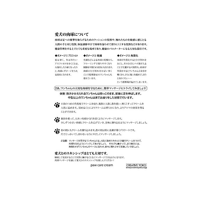 개와 고양이용의 육구손질 크림입니다.살균이나 소불길의 작용이 있고, 약용으로서도 우수한 효과를 발휘하는 벌꿀을 배합했습니다 무착색 무향료 육공이 금이 가 방지에 여름,아스팔트 탐(그을림)을 했 육공의 케어에 플로어링에 살아가는 강아지의 미끄럼방지로 샴푸나 발세 있의 다음에 육공의 상태를 확인 하면서,상냥하게 맛사지 하는 바와 같이(하도록) 발라 주세요.물론 빨고도 안전합니다