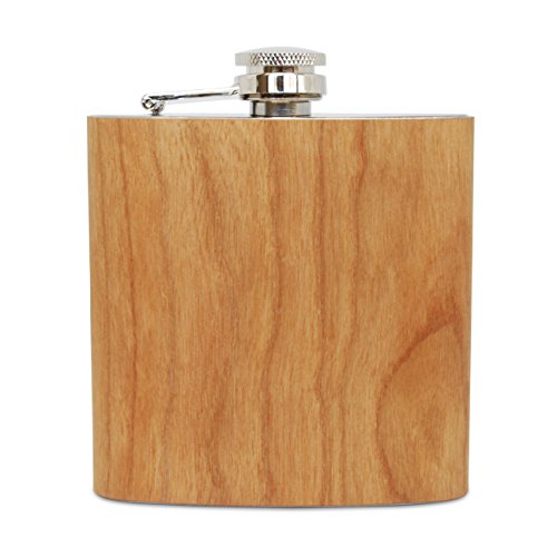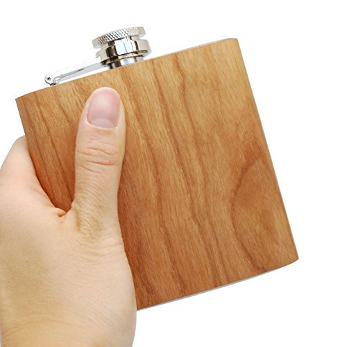 -. Feature : High Quality Stainless Steel with Cherry Wood Veneer (Grain differs slightly due to nature of wood) / Beautiful Laser Etched Design / Capacity: 6 oz (approx. 7 shots) / Dimensions: 4.3" x 3.6". Curved design for an easy and comfortable grip / Designed, Laser cut & Etched in USA