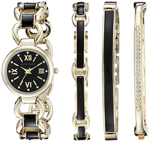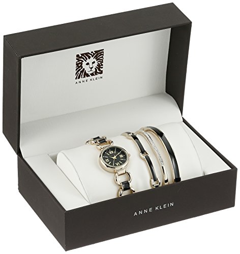 -. Binding : Watch -. Brand : Anne Klein -. Color : Black/Gold -. Department : womens -. EAN : 0086702571253 -. Feature : Gold-tone bracelet watch featuring bold black dial with sparkling Swarovski crystals at hour markers / Set includes one curved-link bracelet with black enamel filling, one black enamel-filled bangle, and one gold-tone bracelet studded with Swarovski crystals / 24-mm metal case with mineral dial window / Japanese quartz movement with analog display / Alloy bracelet with jewelry-clasp closure / Water resistant to 30 m (99 ft): In general, withstands splashes or brief immersion in water, but not suitable for swimming -. Label : AK Anne Klein -. Manufacturer : AK Anne Klein -. Model : AK/1982BKST -. MPN : AK/1982BKST -. PackageQuantity : 1 -. PartNumber : AK/1982BKST -. ProductGroup : Watch -. ProductTypeName : WATCH -. Publisher : AK Anne Klein -. Studio : AK Anne Klein -. Title : Anne Klein Women's AK/1982BKST Swarovski Crystal-Accented Gold-Tone and Black Watch and Bracelet Set -. UPC : 086702571253