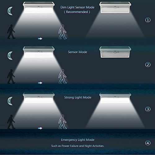 - ✔ 4 Adjustable Modes Motion Activated Solar Security Light: This solar motion light have 4 working modes: dim light sensor mode, strong light sensor mode, always on mode, emergency light mode.You will only press the button to change the mode to meet what you need everytime and everywhere.