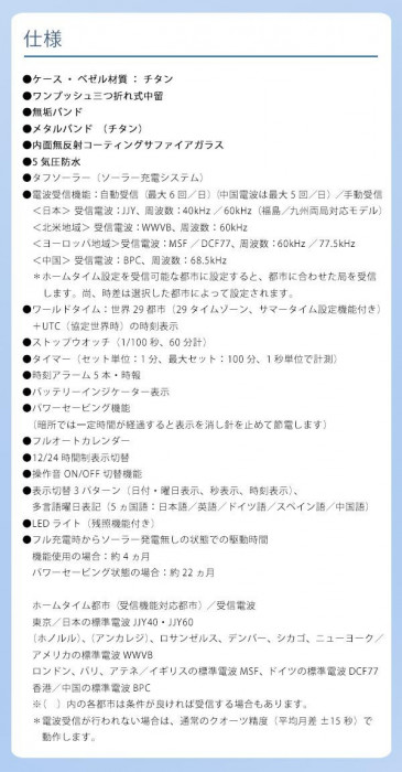 | 仕様 | 男性/紳士用腕時計 適応サイズ(腕まわり):15.0~20.5cm 使用電池:ソーラー充電電池(内蔵) 充電二次電池寿命:約7~10年 |
