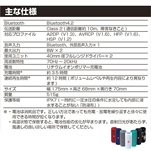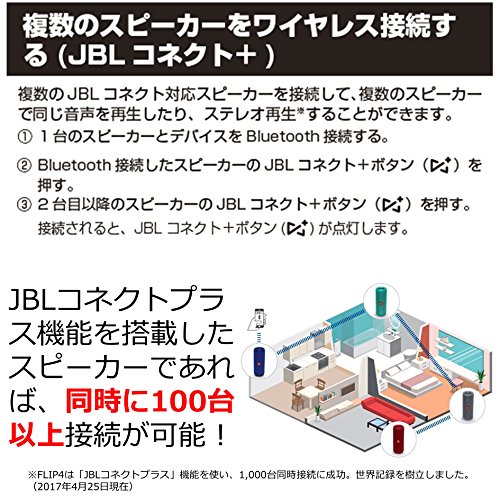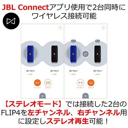 パッシブラジエーター搭載により迫力あるJBLサウンドが楽しめ、またIPX7に対応し、海辺やプールサイドでも安心して使えます。さらに、ボイス・アシスト機能に対応しているので、Siri/GoogleNowの使用も可能です。新たに100台以上同時接続可能なJBLコネクトプラスに対応しておりスマートホンなどから、複数代のFLIP4に接続、同時再生が可能です。2台同時接続時はステレオ再生も可能。