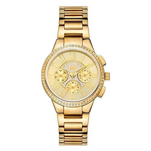 Highest Standard Japan Quartz Movement 18k gold-plated stainless steel bezel; 16 genuine diamonds Multi-function dial displaying the day, dual time, and 24hr time with roman numerals and crystal accents in the center 18k gold-plated stainless steel bracelet with deployment clasp Water-resistant to 165 feet (50 M)