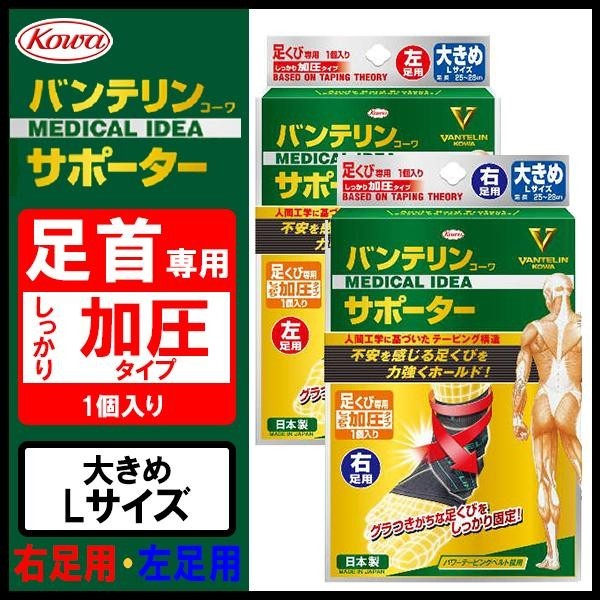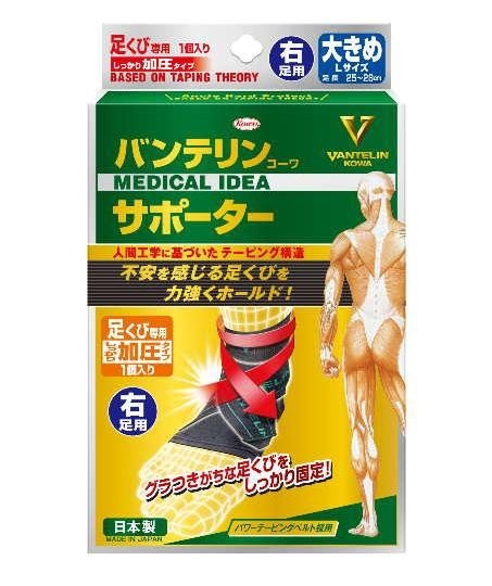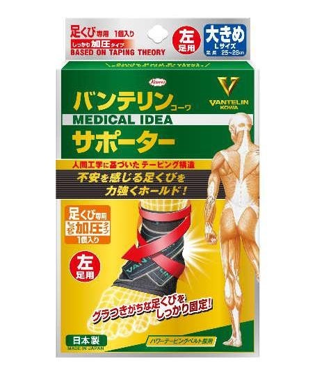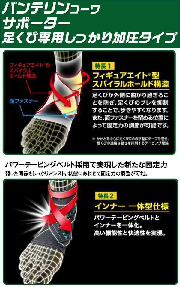 バンテリンコーワサポーター足くび専用にしっかり加圧タイプが新登場!足くびが外側に曲がり過ぎることを防ぎ、足くびのブレを抑制することで、歩きやすくなります。また、面ファスナーを留める位置によって固定力の調節が可能です。 |
