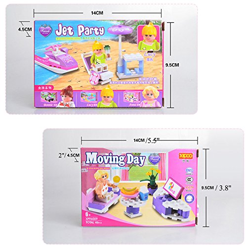 -. Feature : Certified Non-Toxic our building set? is BPA-Free, Lead-Free and Phthalates-Free. / Jet Party -When Leisure, Lucy's hobby is driving a boat on the sea and run! : Package Size 5.5"Lx3.8"Wx2"H, Piece Count: 47pcs; / Moving Day - Leisure time, Anna likes to atay at home to watch her favorite TV show and eat fruit : Package Size 5.5"Lx3.8"Wx2"H, Piece Count: 46pcs; / Your child deserves a more productive activity than video games, phones and tablets. This blocks are built to develop your child's Science, Technology, Engineering and Math skills. Supports logical thinking and problem solving, unleashing your child's imagination to endless possibilities. / Great gift idea: This gift will help kids build fine motor skills, hand-eye coordination and enhance creativity while keeping them entertained for hours! For small child about 4-5 will need a little help of an adult, good experience for children 6+, perfect birthday gifts, Christmas presents.
