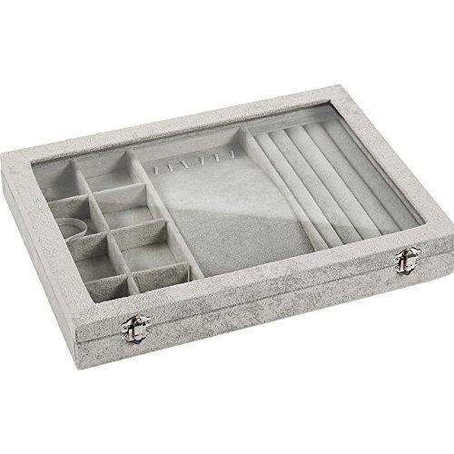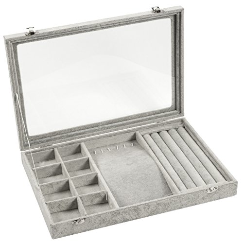Jewelry Box – Stackable Display Case, Jewelry Organizer Tray for Necklaces, Earrings, Bracelets with Transparent Glass Top, 8 Compartments, 4 Slots, 6 Hooks, Grey - 13.9 x 2 x 9.5 Inches