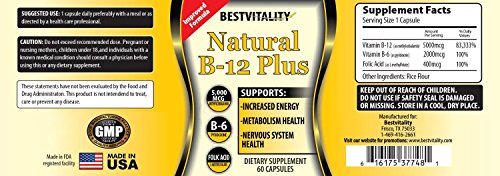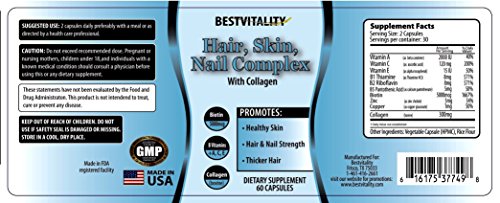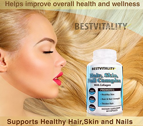 -. Feature : Changes to skin, grayish, dry scaly around nose and mouth? Loss of appetite, Lassitude, muscle pain nausea? Tingling/numbness in the hands and feet? Depression and hair loss? You may have Biotin Deficiency and you are in the right place. This formula contains Vitamin E, B1 Thiamine, B2 Riboflavin, B5 Pantothenic Acid, Biotin, Zinc, Copper and Collagen. This is a potent combination with several ingredients to support healthy skin, hair, nails. / Five Critical Health Benefits of Biotin: 1.Strengthen hair and nails 2. Improves the health of your skin 3. Aid in weight loss 4. Lower cholesterol 5. Regulate blood sugar. Our advanced formula are free of wheat, gluten, egg, soybeans, fish, shellfish, peanuts & tree nuts. / Why choose our Natural B Complex Vitamin? This superior quality custom formula contains 5000 mcg of B12, 2000 mcg of B6 and 400 mcg of Folic Acid. Our product is clinically PROVEN to help improve overall health and wellness. / BestVitality Mission Statement: Provide premium/high quality health products to consumers seeking a trusted brand. Our boutique style approach to our designer vitamin engineering provide for ideal nutrient combinations that are well absorbed by the body / American Made: We are a family owned and operated small business, based right here in the US