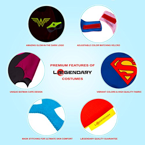 -. Feature : ✅ HOURS OF FUN & CREATIVE PLAY! As parents, we want our kids to spend as much time playing creatively, and less time watching TV, right?! What could be more fun than pretending you're Batgirl, Supergirl. Wonder Woman or Spidergirl? Your sweet child can be the P.R.Incess of the Amazons, pretend to fly, or demonstrate super-strength, as they save the day like never before with their very own premium Superhero Costumes Gift Set. Great for girls ages 3 to 10 years old. / 🎃 GREAT HALLOWEEN & PRETEND PLAY COSTUMES TO ENJOY ALL THE YEAR... If your kids are like most children, they probably love playing dress up - daily. With our popular superhero costumes kit, your kids can enjoy wearing their glow in the dark capes and masks while they go trick-or-treating, or just playing heroes with friends. They can enjoy the magic of playing superheroes all year long! / 👏 ENCOURAGES IMAGINATION AND CREATIVITY- One of the greatest parts of childhood is being able to play dress-up toys and costumes. The power of budding imaginations is truly magical. With our premium quality superhero cape and mask set, you can encourage more hours of screen-free fun! It can be worn over pajamas or regular shirts and clothing. Imagination is like building a muscle, the more you use it, the bigger it gets! / 🎁 MAKES A PERFECT BIRTHDAY OR CHRlSTMAS GIFT! If you are looking for a great boy gift that has that "extra-cool and exciting" wow factor, then you will definitely love our LÆGENDARY costumes for boys set. It comes with 4 premium capes and masks, for Batgirl, Supergirl, Wonder Woman and Spidergirl. This stitching is extra soft to eliminate itchiness and scratchiness. The set also comes with a BONUS: 4 matching super hero hair elastics that can also be used as bracelets. / 💛 ONLY THE BEST FOR YOUR LITTLE ONE...We P.R.Ide ourselves on providing top quality products and service for our amazing customers. We created our party capes for kids and accessories with extra care and attention-to-detail to provide the best "dress-up" experience for your sweet child. You can add your hero capes set to your cart with total peace of mind, knowing that if you aren't 110% happy with your purchase, we'll provide you a FULL refund.