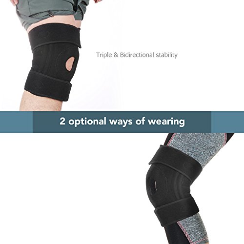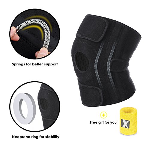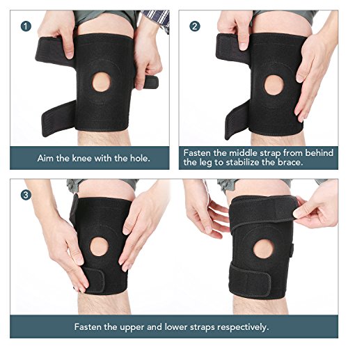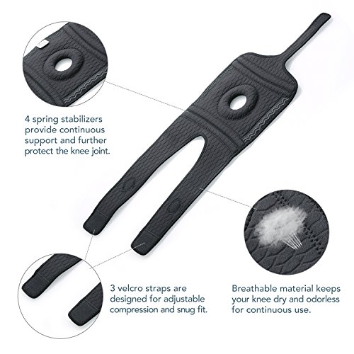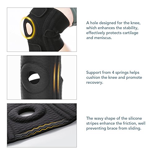 -. Feature : 【Care for your knees】: patella stabilizer and 4 enclosed firm plastic tubes that act as buttresses around the kneecap will effectively reduce patella subluxation and degeneration by appyling constant pressure to the knee joint / 【Open-patella with adjustable Velcro straps】: apply enhanced pressure while allowing mobility, contribute to relief of acute and chronic pain associated with patella tendonitis and off-tracking. ★ knee circumferences: 12.5-16" / 【Anti-slip fit】: built with 2 pairs of soft silicone wavy strips which would keep the brace in place and prevent slipping / 【Skin-friendly material】: made of lightweight, breathable materials, this knee brace would be so natural to wear on during sports without any stuffy feeling, open kneecap also works as added ventilation / 【Additional wrist band:】 free wrist band will help to absorb sweat effectively while training in the gym