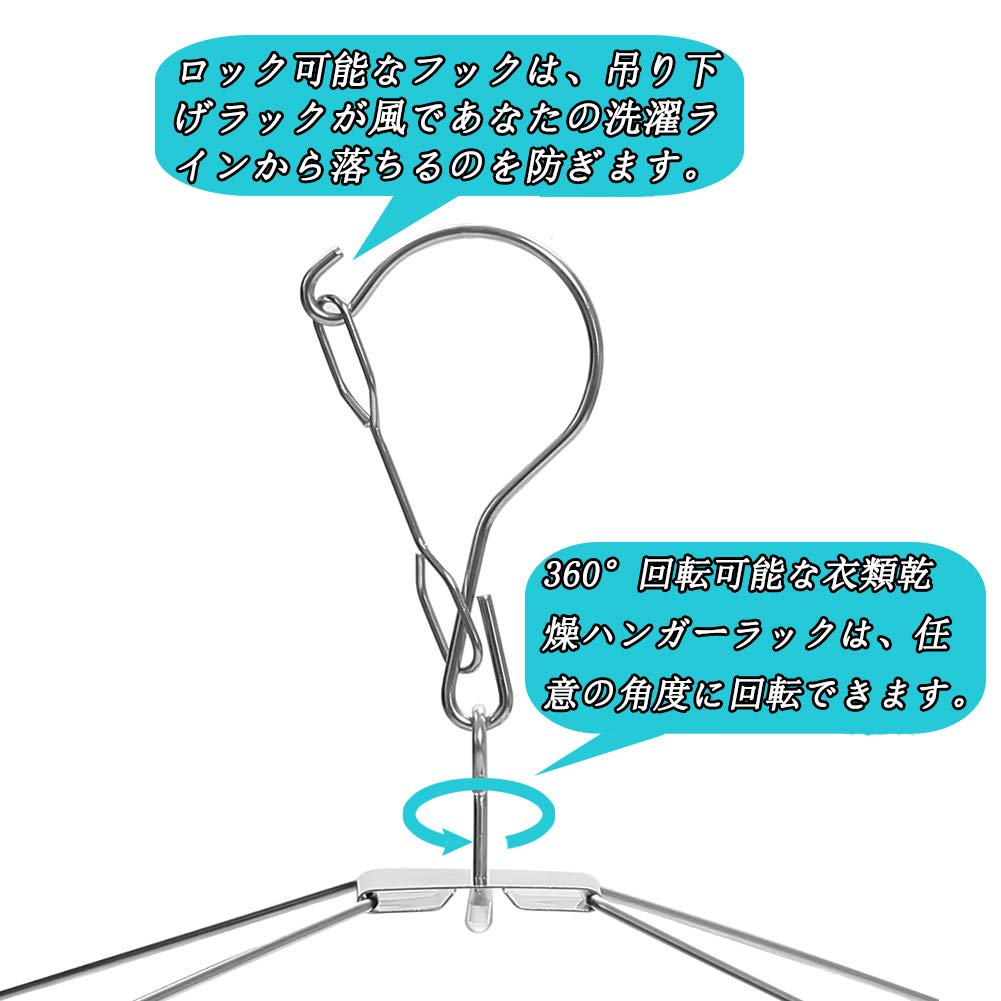 【落ちる防止・物干しやすい】物干し竿に掛けるフックはキャッチフック式なので、強い風が吹いても、ハンガーが回転だけ、落ちるなし。そして、360度回転で、通気性がよく、全方向から洗濯物を干す。服を取り入れる時も便利な洗濯ハンガー。
