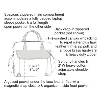 -. Feature : 16 oz Pre-Washed Canvas w/ Bocking for Durability, Repel Water / 15.75'' x 14'' x 4.75'', Back drop-in zippered pocket (not shown), A gusset pocket under the faux leather flap w/ a magnetic snap closure & organizer inside front pocket / Spacious zippered main compartment accommodates a fully padded laptop sleeve pocket & a full length open pocket on the other side / Pre-washed canvas w/ backing to repel water plus faux leather trim & zip pull, and antique brass hardware & heavy duty zipper / Soft grip handles & 2"W heavy cotton adjustable shoulder strap
