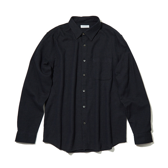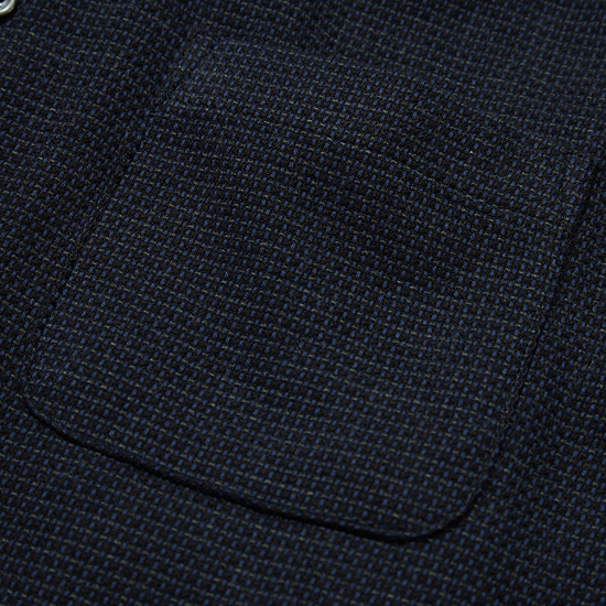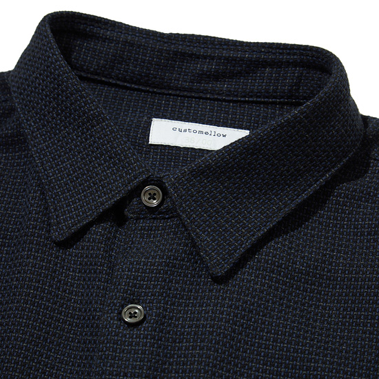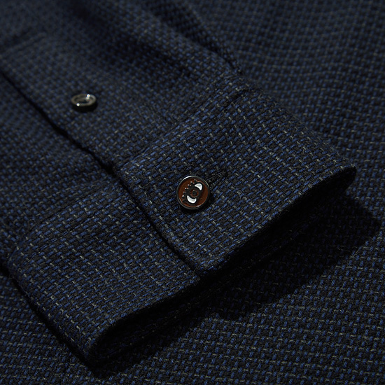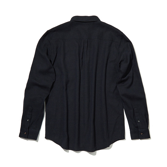- 블루, 차콜, 블랙 세가지톤의 믹스된 조직감 있는 원단으로 제작한 셔츠.