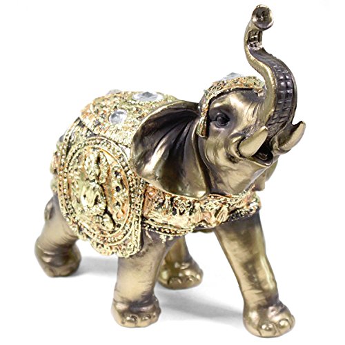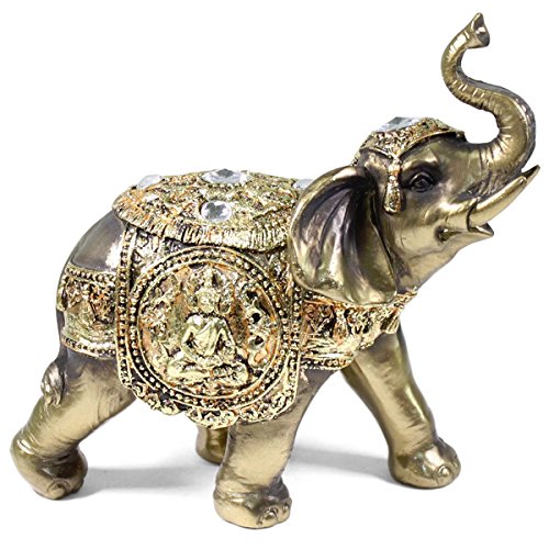 -. Feature : An elegant elephant statue. It symbolizes power, wisdom, strength, fertility, protection of the home!! / Antique style statue with the trunks facing upwards to represent prosperity, good luck, and success!! The cloak is finely engraved with a peaceful buddha and beautiful acrylic jewel with striking gold color. / Decorative statue to put in office, front door, living room and beside the bed for good Feng Shui. / Perfect for birthday, holiday, and housewarming gifts! / Material: Polyresin Size: 7"(H) X 7" (L) X 4"(D) approx