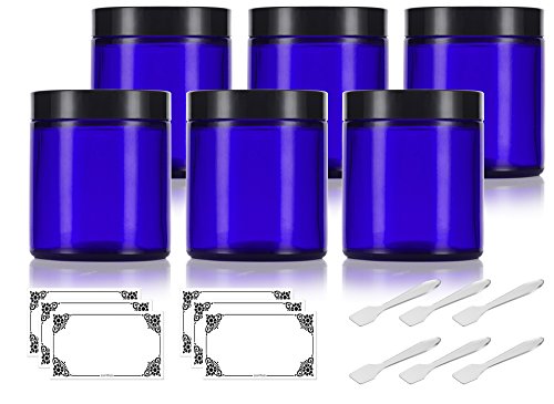 Cobalt Blue Glass Straight Sided Jars - 4 oz / 120 ml (6 pack) + Spatulas and Labels - Airtight, Smell Proof, BPA Free Lids