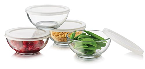 Great for soup, cereal, or as glass storage containers, this set contains four 5" glass bowls and four clear plastic lids. Glass is dishwasher safe. Hand washing recommended for the plastic lids. Made in Mexico.