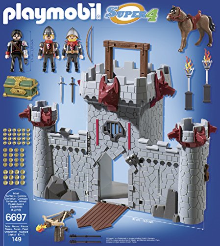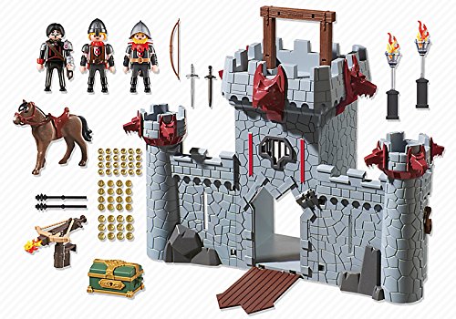 Danger lurks in the depths of the Black Baron's Castle, so be on guard! This take-along set opens up to create a formidable castle that is well defended with a functioning drawbridge and firing crossbow. The two corner towers also provide excellent lookouts to see if friends or foes are approaching, but enemies can break through the Black Baron's defenses thanks to the breakaway wall. When play time is over, simply store the pieces inside, close the side walls, and latch shut for safekeeping. The convenient carrying handle makes this set truly portable and perfect for on-the-go fun! Set includes Black Baron and two knight figures, horse, treasure chest with gold, functioning crossbow, breakaway wall, sword, torches, and tons of other SUPER accessories. Recommended for ages five and up. Playmobil, Germany's largest toy manufacturer, is headquartered in Zirndorf, Germany and has been producing and distributing toys for more than 36 years. The miniature worlds of Playmobil encourage children to explore and learn while having fun. Children's imaginations are transported to medieval times with the Playmobil castle, to the adventurous seas with Playmobil pirates, and many other themed play worlds. The figures can bend, sit, stand, and turn their heads to make realistic role play possible.Feature