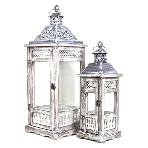 -. Title : Antique Style Wooden Lanterns -- Windproof Light Wrought -- Set of 2 -- Washed Grey