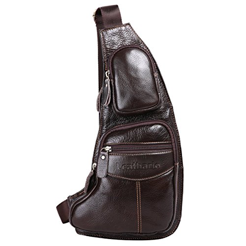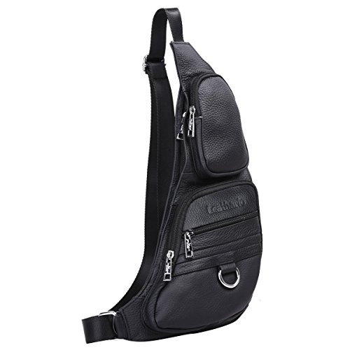 Leathario leather Retro Men's Unbalance Chest Pack Multipurpose Backpack Crossbody Shoulder Bag Black.