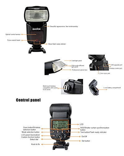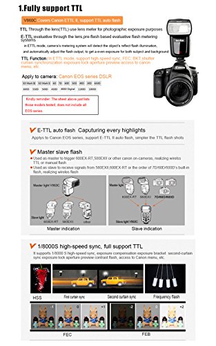 Support Canon E-TTL II autoflash, Manual and Multi flash modes. User-friendly LCD display and control panel with firmwave upgrade.