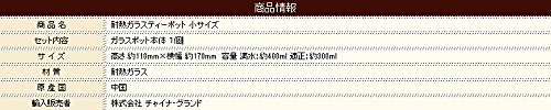 容 量 400ml 素 材 耐熱ガラス 産 地 上海市 特 徴 スリット茶漉しが付いているので、中国茶だけでなく、緑茶や紅茶、ハーブティーにもお使い頂けます。