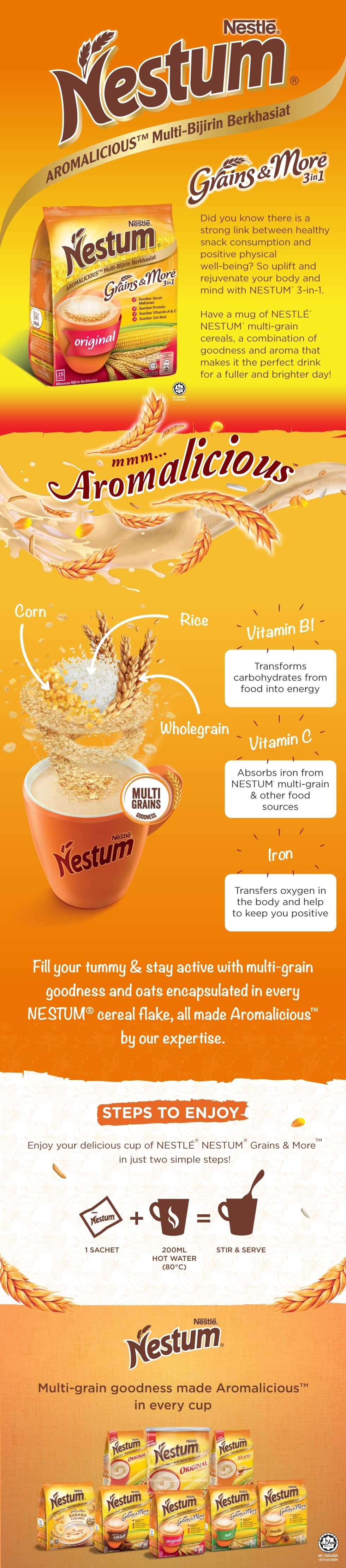Fill your tummy & stay active with multi-grain goodness encapsulated in every NESTUM® cereal flake, all made Aromalicious™ by our expertise.