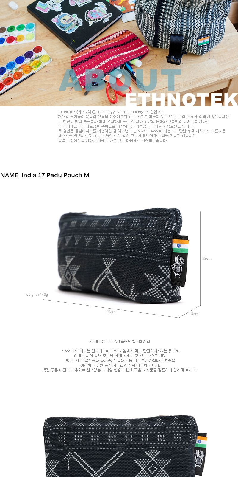 에스노텍의 모든 페브릭은 여러 나라 아티산들에 의해 핸드메이드로 만들어지므로 고유의 냄새가 날 수 있으며, 원단 재단에 따라 조금씩 이미지가 달라집니다. 이 점을 인지해 주시고 주문해 주시기 바랍니다.
