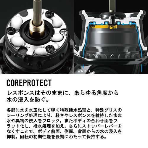 Response는 그대로에,모든 각도로부터 수의 침입을 막는다.각부로 수를 물방울화 해 연주하는 특수 발수 처리와,특수 grease의 실링 처리에 의해가벼움이나 Response를 유지한 채로 수나 이물질의 침입을 블럭.또한 바디의 합해면을 플랫화 하고, 발수 처리를 더하고, 한층 더 스토퍼 레버를 없애는 것에,바디 전면,측면,배면에서의 수의 침입을 억제.회전 초기 성능을 장기에 걸쳐 유지한다.