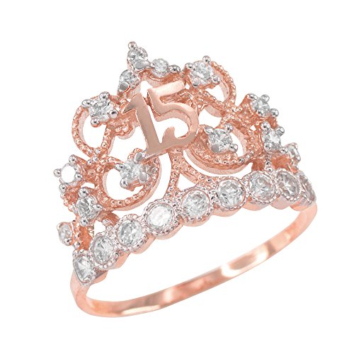 -. Title : 14k Rose Gold CZ-Studded Crown Sweet 15 Anos Quinceanera Ring