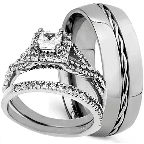 -. Feature : Matching set + FREE Small Gift Box / Womens SOLID Sterling Silver (Stamped .925 to indicate Authenticity) and Mens SOLID TITANIUM (Hallmarked TITANIUM to indicate Authenticity)) / 3 piece womens Sterling Silver Ring with Rhodium Plated Finish and SOLID Titanium Band / The ring set is BRAND NEW and guaranteed to be in 100% perfect condition. / Womens Sizes AVAILABLE: 5 6 7 8 9 10 Mens Sizes AVAILABLE: 7 8 9 10 11 12 13