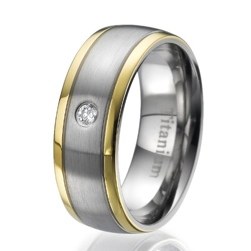 - Title : 8mm Titanium Ring with 2 stylish yellow gold plated stripes on the sides and a round zirconia