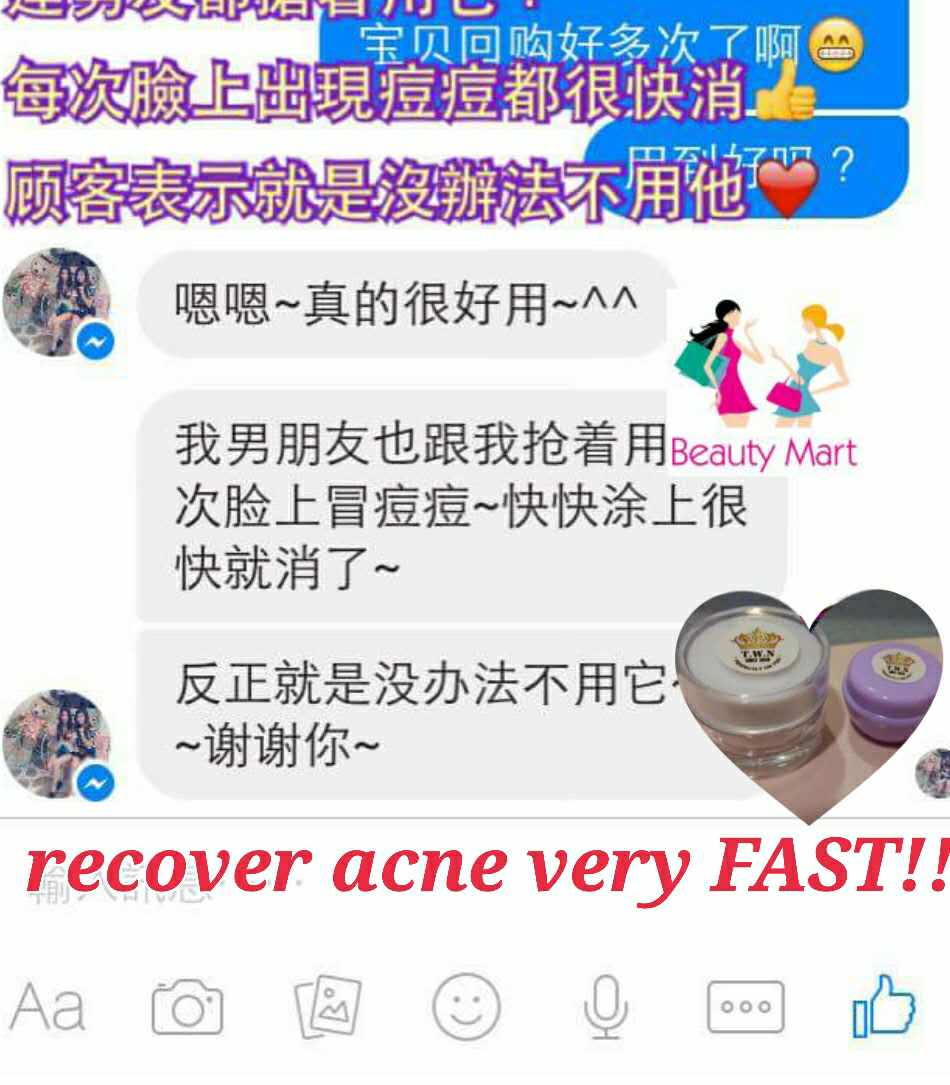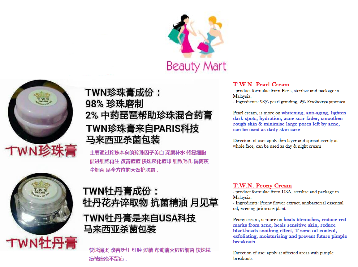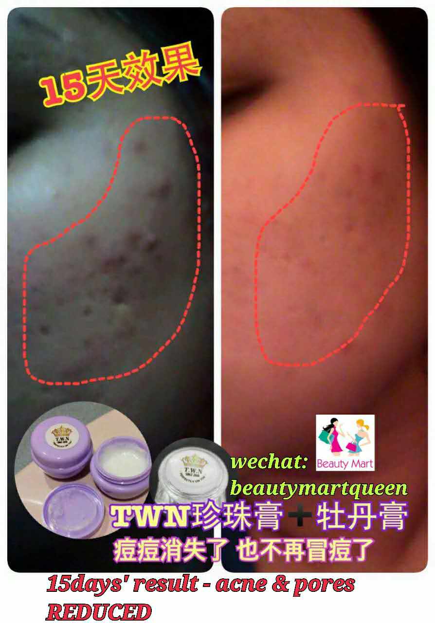 脸部清洁后 ☞ 爽肤水 toner 帮助收细毛孔 清理污垢 ☞ TWN珍珠膏 薄薄一层 全脸带过 (珍珠膏珍珠含量非常高 厚用反而会浪费哟)☞ 保湿霜 (如果有)☞ 牡丹膏在有痘痘泛红敏感发炎的地方(✖ 不可全脸)