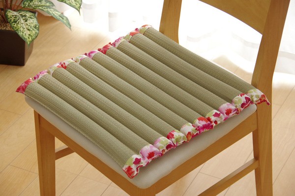 水彩タッチの花柄が特徴のい草クッションです。筒状の綿が入ったものをつないでいますので、敷けばシートクッションに、立てればセアテクッションに、丸めると枕にといろんなところで使うことができます。