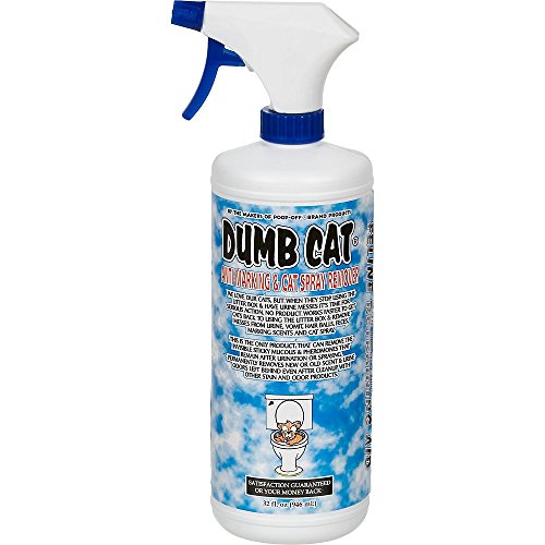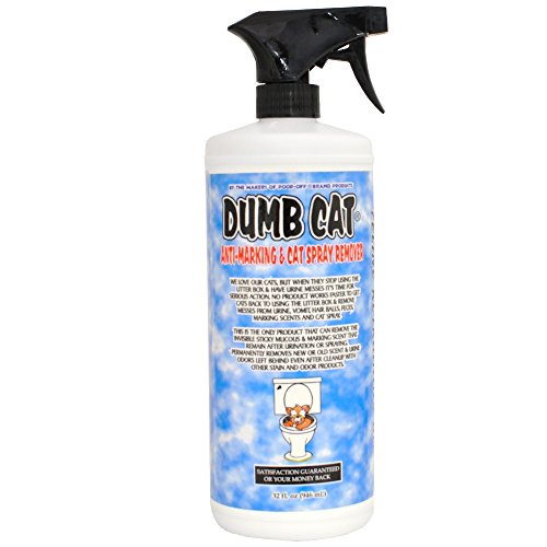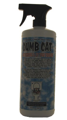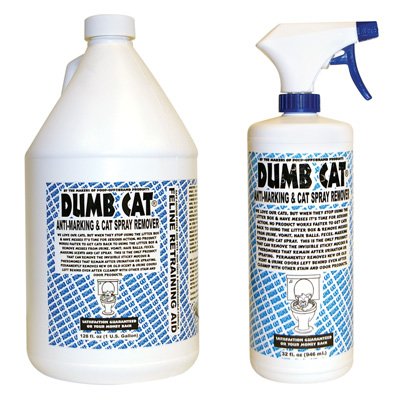 Product Description This is a feline retraining aid. Dumb Cat works by controlling a cats urination in carpeting and floors where they confuse their urines natural marking scent for their litter box. Works by removing the invisible sticky mucous and pheromones that remain after urination or spraying. Specifically developed to make a cat use their litter box not your carpets or floors. Permanently removes new or old scent and urine odors left behind even after cleanup with stain and odor products. Utilizes the latest in scent elimination technology to control your cats urination outside the litter box. Dumb Cat is effective by eliminating the scent, not just the odor. Dumb Cat works where natures enzyme products fail. Dumb Cat contains a deterrent and residual action ingredient to prevent feline urination outside the litter box. Non-toxic Bio-degradable.