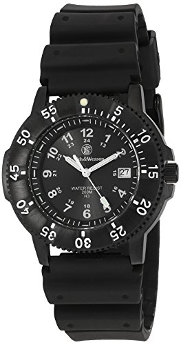 -. Binding : Watch -. Brand : Smith & Wesson -. Color : Black -. Department : mens -. EAN : 0024718145013 -. Feature : Black steel case with black dial, white numbers and white hands / Equipped with a tritium light source that provides over 20-years of constant glow / Water resistant up to 200-meters (660-feet) / Includes black rubber strap, rotating bezel and date display / Comes with a 1-year limited warranty -. Label : Smith & Wesson -. LegalDisclaimer : The Smith & Wesson Sport Watch features Tritium H3 illumination, a nylon and rubber strap (initerchangeable), and stainless steel case and bezel. -. Manufacturer : Smith & Wesson -. Model : SWW-450-BLK -. MPN : SWW-450-BLK -. NumberOfItems : 1 -. PackageQuantity : 1 -. PartNumber : SWW-450-BLK -. ProductGroup : Watch -. ProductTypeName : WATCH -. Publisher : Smith & Wesson -. ReleaseDate : 2013-09-06 -. Studio : Smith & Wesson -. Title : Smith & Wesson Men's SWW-450-BLK Sport Swiss Tritium H3 Black Dial Black Band Watch -. UPC : 024718145013