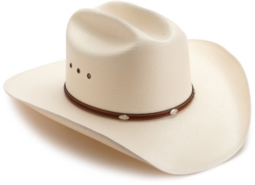-. Binding : Apparel -. Brand : Stetson -. Department : mens -. Feature : 8x straw / Avg brim size: 4 inch avg crown height: 4 1/8 inch / Brown band / This stetson alamo 8x straw hats features a two tone tan leather band decorated with small silver oval conchos. the hat also has three brown eyelets on each side. -. Label : Stetson -. Manufacturer : Stetson -. Model : SS8230 -. PackageQuantity : 1 -. ProductGroup : Apparel -. ProductTypeName : HAT -. Publisher : Stetson -. Studio : Stetson -. Title : Stetson Men's Alamo Hat