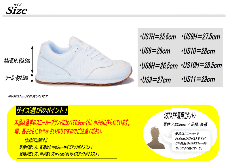 | サイズ | 作り⇒やや小さめ 【サイズ選びのポイント!】 足幅が細い方、普通の方⇒0.5cmくらいサイズアップがオススメ! 足幅が広い方、甲が高い方⇒1.0cmくらいサイズアップがオススメ! |
