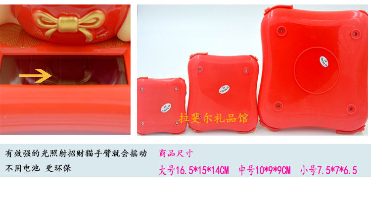 One hand swing Lucky cat has three sizes: large 5.5 inch, medium 3.5 inch, trumpet 2.5 inch.