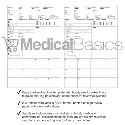 Templates include areas for: vital signs, hourly medication administration, assessment notes, labs, patient history, review of symptoms and enough space for free text and notes