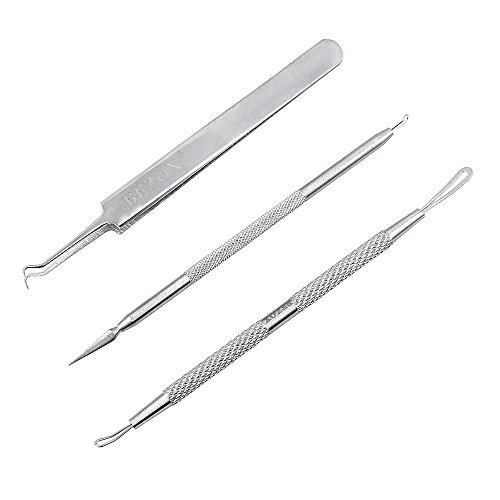 Perfect matched set: Sharp needle for the first treatment, double-ended tool for common blackhead, curved tweezer designed for awkward blackhead.