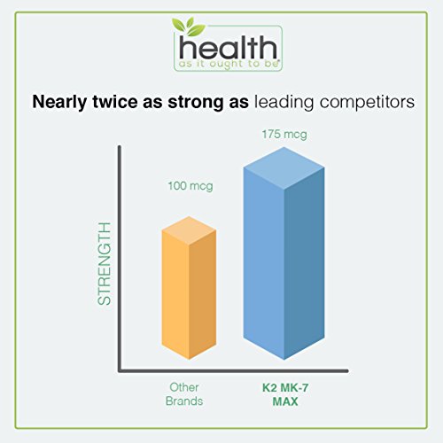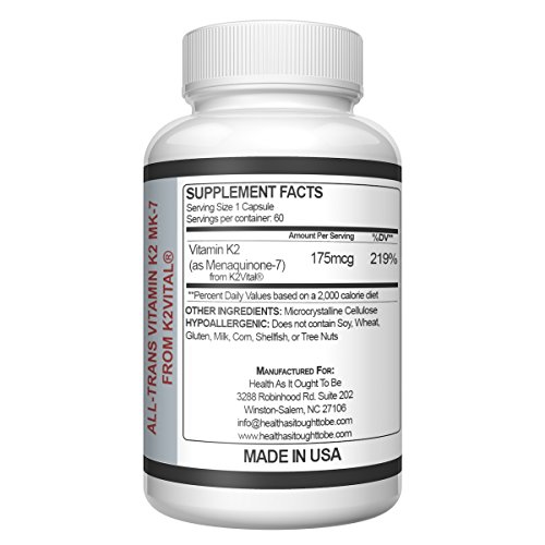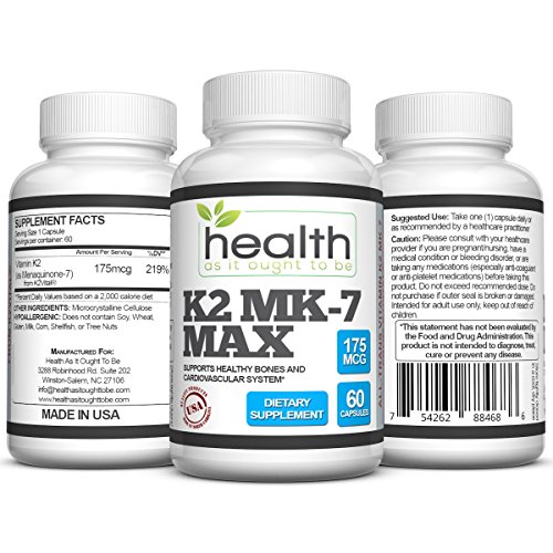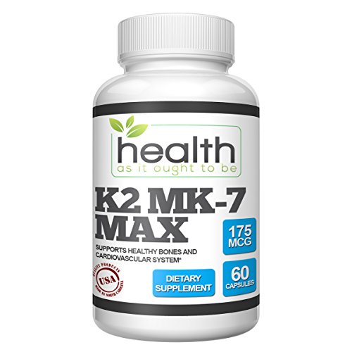 -. Binding : Health and Beauty -. Brand : Health As it Ought To Be -. EAN : 0754262884686 -. Feature : Only K2 MK-7 made with K2Vital®. / K2Vital® is produced from two flower extracts and is tested for purity / 175mcg dose in 100% all-trans configuration is much more effective than competitors 100mcg dose. / Documented Pure and "Free From" - K2VITAL® is free from all known allergens, metals and organic solvents / Proven Highest Biological Activity and Safety -. IsAdultProduct : 0 -. Label : Health As It Ought To Be -. Manufacturer : Health As It Ought To Be -. ProductGroup : Health and Beauty -. ProductTypeName : HEALTH_PERSONAL_CARE -. Publisher : Health As It Ought To Be -. Studio : Health As It Ought To Be -. Title : K2 MK-7 MAX From K2Vital®. Extra Strength 175mcg Per Capsule. 100% All-Trans Structure. Derived From Two Flower Extracts. Soy Free. Proven Bioavailability and Safety. -. UPC : 754262884686