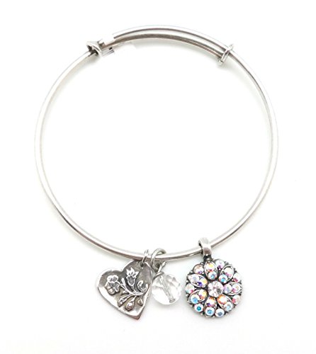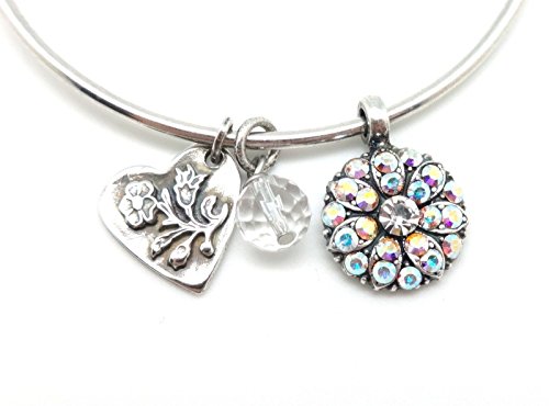 -. Feature : Silver Plating over Brass, Nickel Free / Hypo Allergenic / Beautiful Swarovski Crystals in Crystal AB - Color 001AB "On A Clear Day", Guardian Angel Charm is approximately 5/8" wide by 1" long including jump ring / Heart Charm is approximately 9/16" wide by 3/4" long including jump ring, Round Clear Swarovski Crystal is approximately 5/16" wide by 5/8" long including jump ring / Silver Plated Wire Bangle Bracelet is Adjustable, Approximately 2 1/2" Inner Diameter / Handmade, Mariana Logo Tag with Mineral Stone, Comes in Gift Box with Mariana Storage Pouch and Story Card