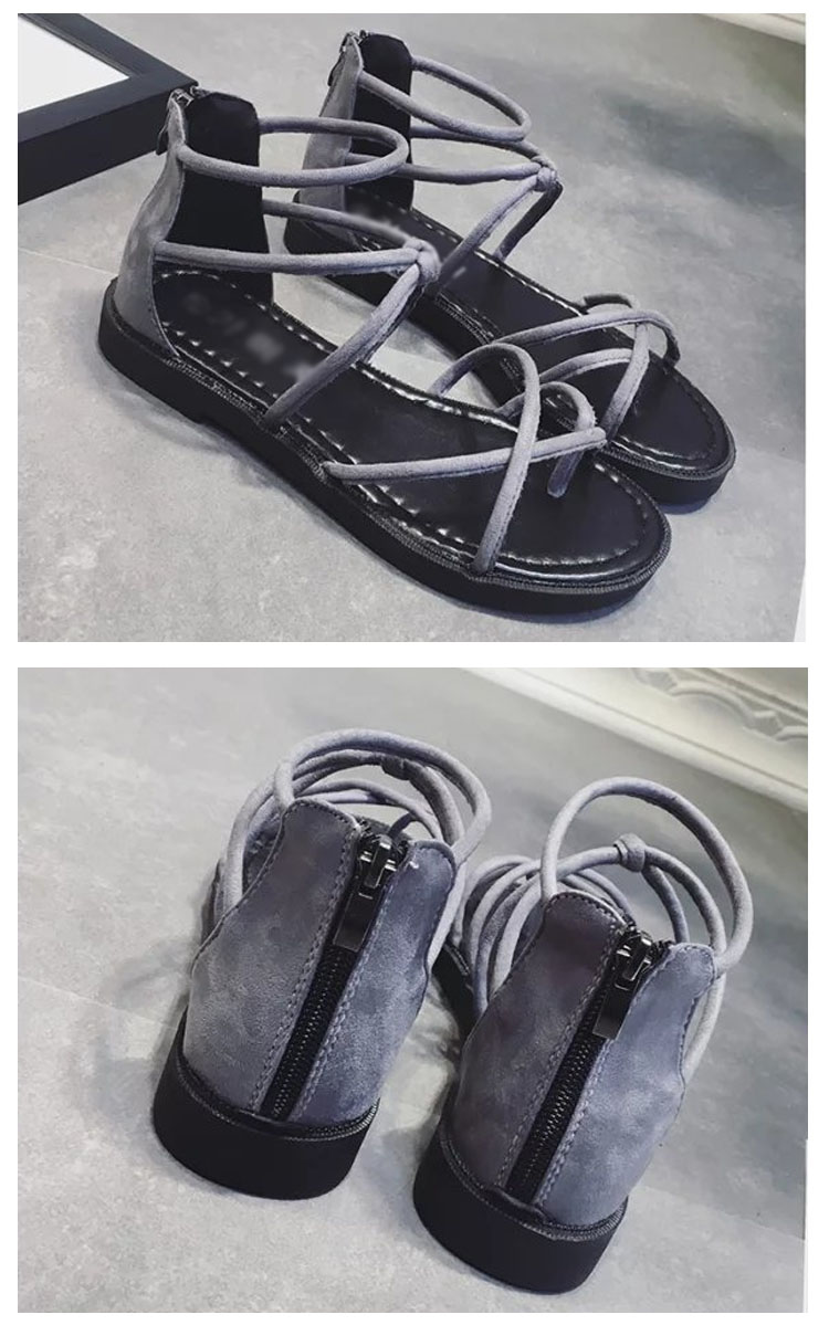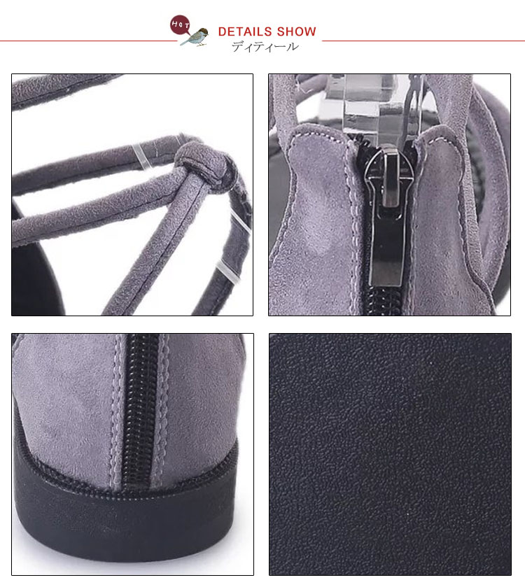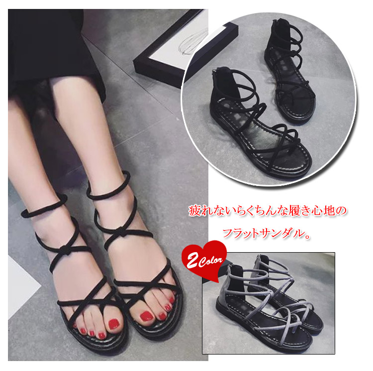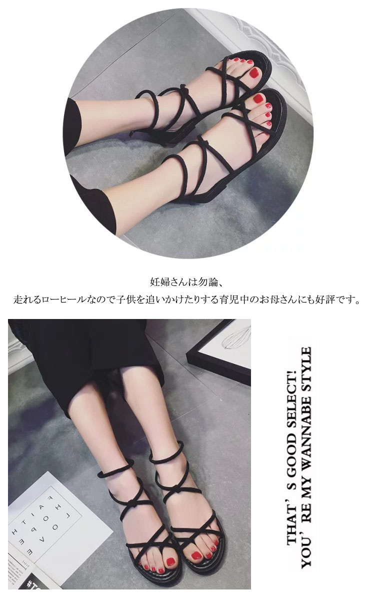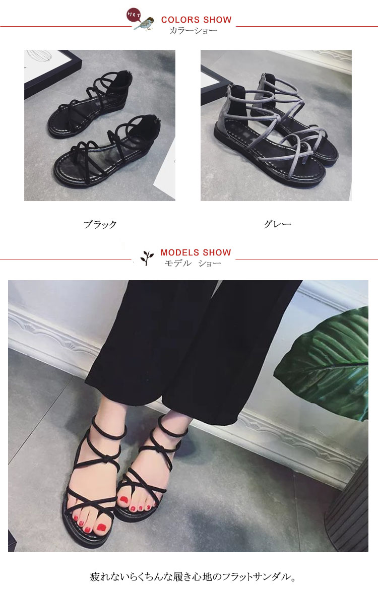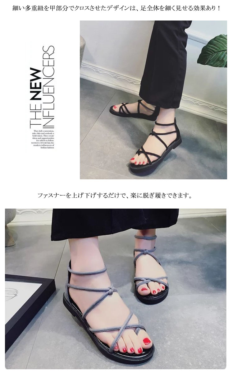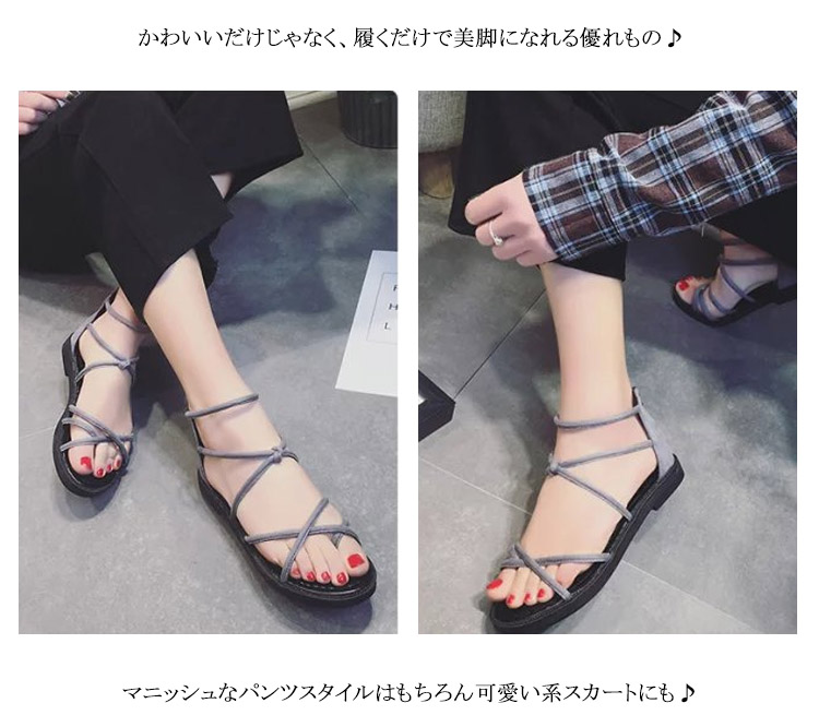 | 疲れないらくちんな履き心地のフラットサンダル。妊婦さんは勿論、走れるローヒールなので子供を追いかけたりする育児中のお母さんにも好評です。細い多重紐を甲部分でクロスさせたデザインは、足全体を細く見せる効果あり!ファスナーを上げ下げするだけで、楽に脱ぎ履きできます。かわいいだけじゃなく、履くだけで美脚になれる優れもの♪マニッシュなパンツスタイルはもちろん可愛い系スカートにも♪どんなコーデにも合わせやすい、キレイ系優秀デザインになります。 | |