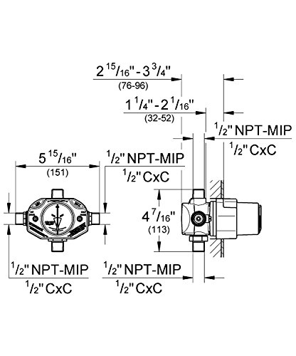 Grohsafe 35015000 pressure balance rough-in valve/mixing valve handle limit stop - limiting the extent of handle movement toward the full hot position Diaphragm cartridge check valves built-in BY-PASS service stops - allows you to shut off water at valve compensates for hot or cold water pressure fluctuations and maintains selected shower temperature - no matter how the water pressure is effected protects against scalding if the cold water supply is cut off by automatically shutting off the flow of hot water protects against cold water shock if the hot water supply is cut off by automatically shutting off the flow of cold water allows back to back installation, eliminating expensive piping includes cap and plug for 3 port installation universal connection is 1/2 inch male by Copper sweat (top port) 5.5 GPM at 45 psi (21 L/min) (bottom port) 5.8 GPM at 45 psi (22 L/min) grohsafe features a rotating handle control which allows the user a wide comfort zone so they can gradually aFeature