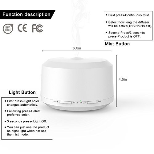 Feature: 1. Classic and simple style design, suitable for each places. 2. 4 Timer Setting,and auto shut off when water runs out. 3. Ultrasonic Technology Keep essential oil 100% natural without burning or heating. 4. 7 Color Changing Mood Lights - white, green, purple, blue, light green, cyan and red. 5. Continuous Mist: Press the mist button, the green indicator light will turn on. Press the button to choose timer.