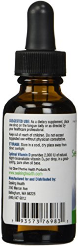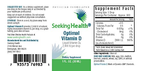 -. Binding : Health and Beauty -. Brand : Seeking Health -. EAN : 0793573769831 -. Feature : Optimal Vitamin D3 Liquid provides 2,000 IU of pure vitamin D3 in each easy-to-take drop. / IMPORTANT: Optimal Vitamin D3 Liquid is manufactured for and sold exclusively by Seeking Health. We DO NOT recommend purchasing this product from any other supplier other than Seeking Health on Amazon.com. / Kids to Senior Citizens can easily accept a drop of great tasting Liquid Vitamin D3. No swallowing pills needed. / Free of Common Allergens. Does Not Contain: preservatives, additives, colors, yeast, egg, wheat, soy, fish, salt, sugar, corn or gluten. / Seeking Health Liquid Vitamin D3 is obtained from the lanolin that comes from the wool of unharmed sheep. -. Label : Seeking Health -. Manufacturer : Seeking Health -. MPN : VITAD-1OZ-LIQUID -. NumberOfItems : 1 -. PackageQuantity : 1 -. PartNumber : VITAD-1OZ-LIQUID -. ProductGroup : Health and Beauty -. ProductTypeName : HEALTH_PERSONAL_CARE -. Publisher : Seeking Health -. Size : 1 ounce -. Studio : Seeking Health -. Title : Optimal Vitamin D3 Liquid | 2,000 IU Per Drop | 900 Servings | High Potency | Physician Formulated | Seeking Health -. UPC : 793573769831
