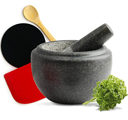 Mortar and Pestle - Premium Quality Granite - Includes FREE silicone scraper, anti-slip counter protector, wooden serving spoon