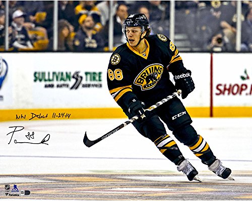 David Pastrnak Boston Bruins Autographed 16" x 20" Black Jersey Skating Photograph with NHL Debut 11/24/14 Inscription - Fanatics Authentic Certified
